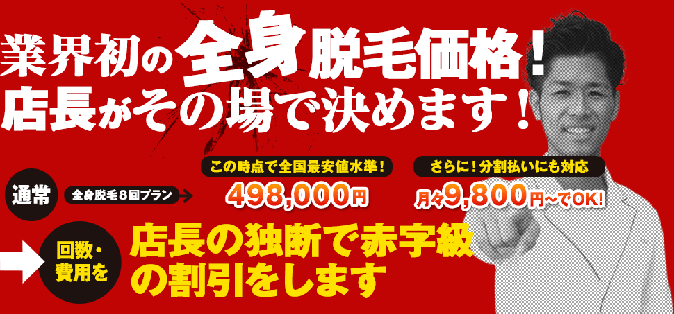 男性のメンズ全身脱毛をどこよりも楽しくお得にご提供致します。YES大阪梅田店、難波店、京橋店、姫路店では陰部脱毛や顔、髭脱毛も全て込みでのお値段になります。